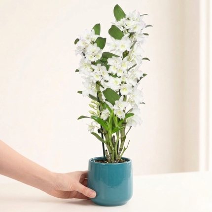 Your orchid will be accompanied by a pretty plant pot.