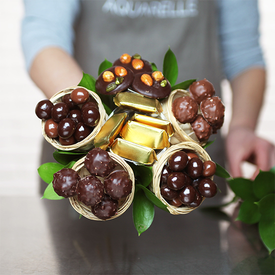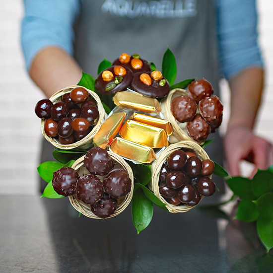 Die Floristen von Aquarelle haben unseren Schokoladenstrauß in eine bezaubernde, genussvolle Kreation verwandelt. Bestehend aus köstlichen Gianduja-Goldbarren, knusprigen Pralinen mit dunkler und Vollmilchschokolade, Mendiants und zartschmelzenden Pralinen mit Nougat – ein 'Schokoladen-Nachmittagssnack' zum Teilen, Verschenken und Genießen ohne zu warten!