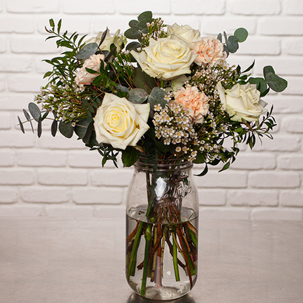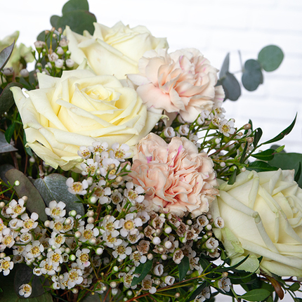 Dieser prächtige „Weißer Blumenstrauß“ wurde als elegante Komposition entworfen und stellt die majestätische White Avalanche Rose in den Mittelpunkt. In Kombination mit der Zartheit der Pfirsichnelken und der Feinheit der Waxflower harmoniert sie wunderbar mit Eukalyptus und schafft so ein subtiles Gleichgewicht zwischen Frische und Modernität. Ein leuchtender Strauß – ideal, um Danke zu sagen, einen Geburtstag zu feiern oder einfach Reinheit und Eleganz in Ihr Zuhause zu bringen.